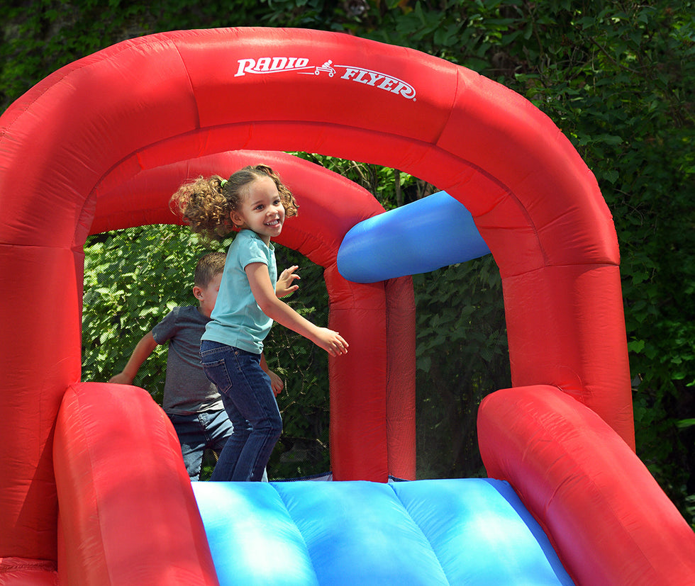 With their thick walls and mesh netting, small and mini bounce houses for families are a great way to get kids moving. It’s no secret that toddlers and young children love to jump around, and with blow-up playhouses from Radio Flyer, they can leap, hop, and practice tricks safely. Plus, active toys like these promote imagination, creativity, and independent play. Choose kids’ bounce houses in three different sizes, from our junior mini bounce house with room for two children to our bouncer XL model, complete with a basketball hoop and room for up to three children. Each inflatable playhouse can offer hours of screen-free play and activity for children up to 8 years old.
