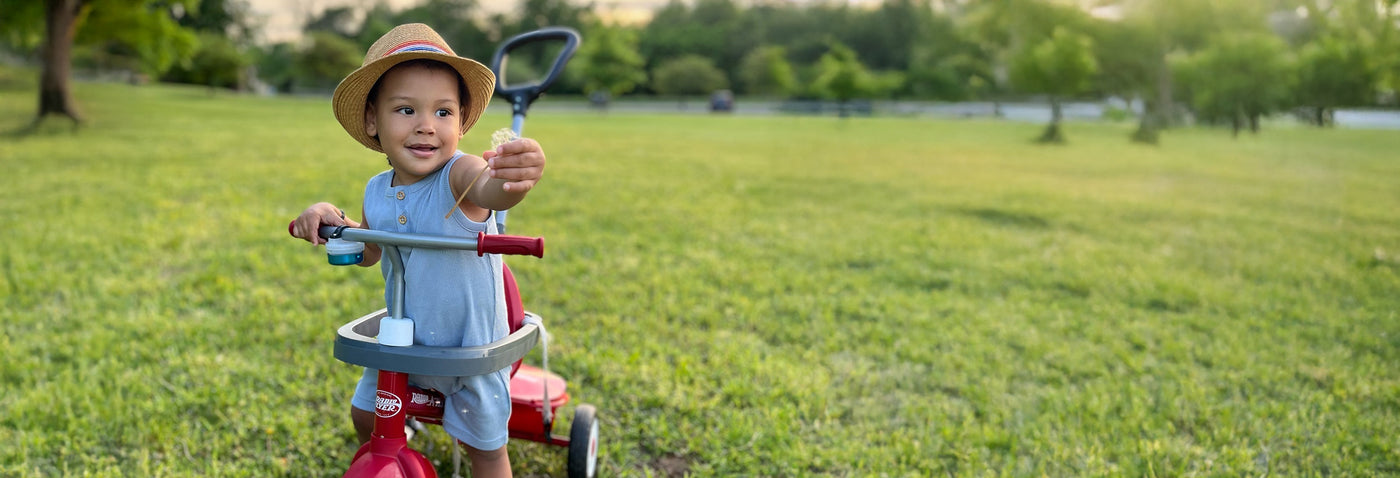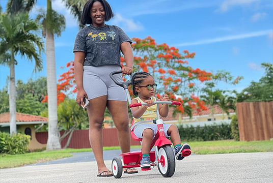 - Adult Steer & Stroll® adjustable trike with handle gives parents control while little ones ride