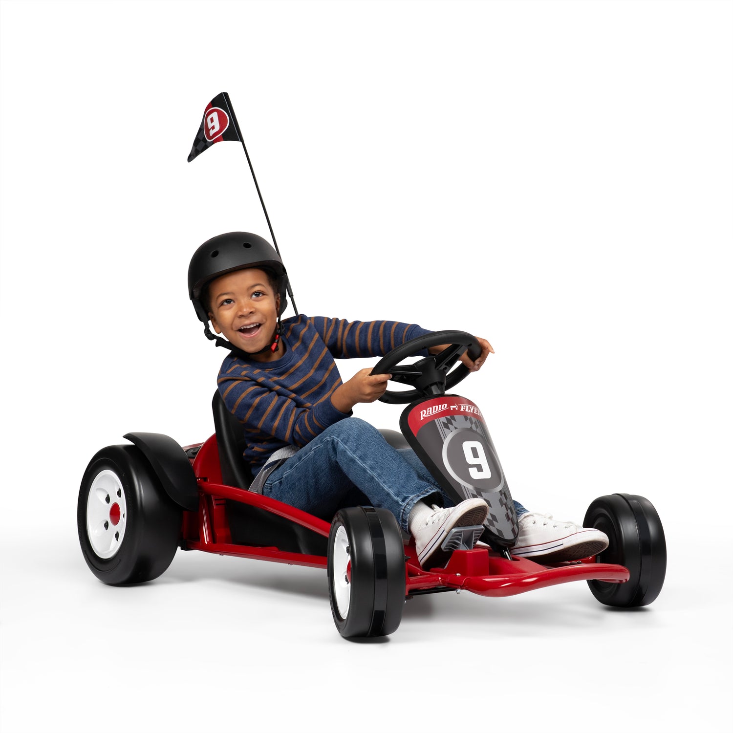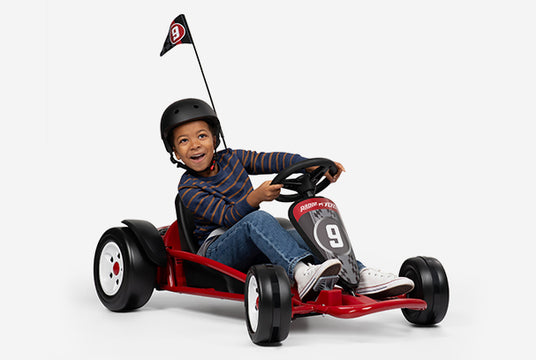 Every kid dreams of having a go-kart at home, and the Radio Flyer Ultimate Go-Kart makes those dreams a reality. Your child will love zooming around at the top speed of 8 mph–using the large rear tires for ultimate drifting action–and racing around the neighborhood in Radio Flyer’s 24V go-kart for kids. Safety features like the high visibility racing flag, hand brake system, and sturdy steel frame ensure your child has fun, and you can worry less. The Ultimate Go-Kart fits toddlers and kids between the ages of 3 and 8 years old, making it the ideal go-kart to grow with your child!
